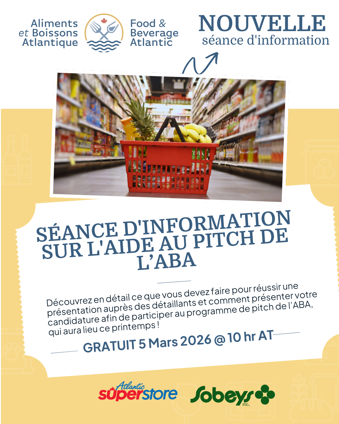 L’ABA (Aliments et boissons Atlantique) est heureuse de collaborer avec des détaillants en alimentation bien connus, Sobeys et Atlantic Superstore, afin de créer des occasions stimulantes pour les entreprises ayant des produits prêts pour le marché.