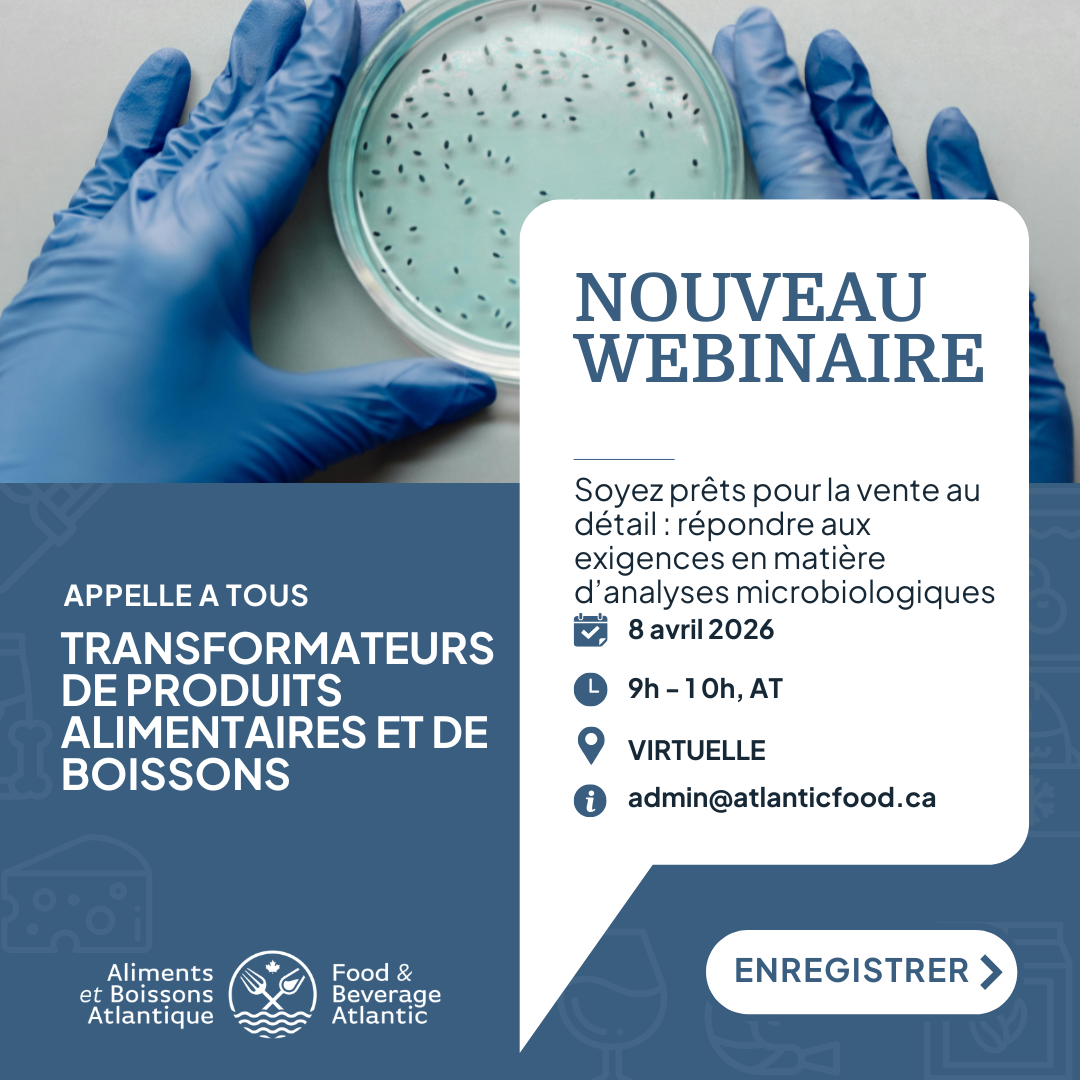 Les détaillants rehaussent leurs attentes en matière de salubrité des aliments, de vérification de l’assainissement et de surveillance de l’environnement. Joignez-vous à Aliments et boissons de l’Atlantique et LuminUltra pour une séance pratique, éclairée par les audits, conçue pour aider les transformateurs alimentaires et de boissons à renforcer leurs programmes de surveillance environnementale et à démontrer leur préparation au commerce de détail en toute confiance.