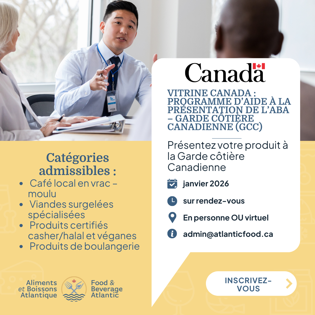 Aliments et Boissons Atlantique (ABA) est ravie de s’associer à Services publics et Approvisionnement Canada (SPAC) et à Service d’aide à l’approvisionnement Canada (SAAC) pour offrir à nos membres une occasion exclusive de présenter leurs produits à la Garde côtière canadienne (GCC) en tant que fournisseurs potentiels du gouvernement fédéral.