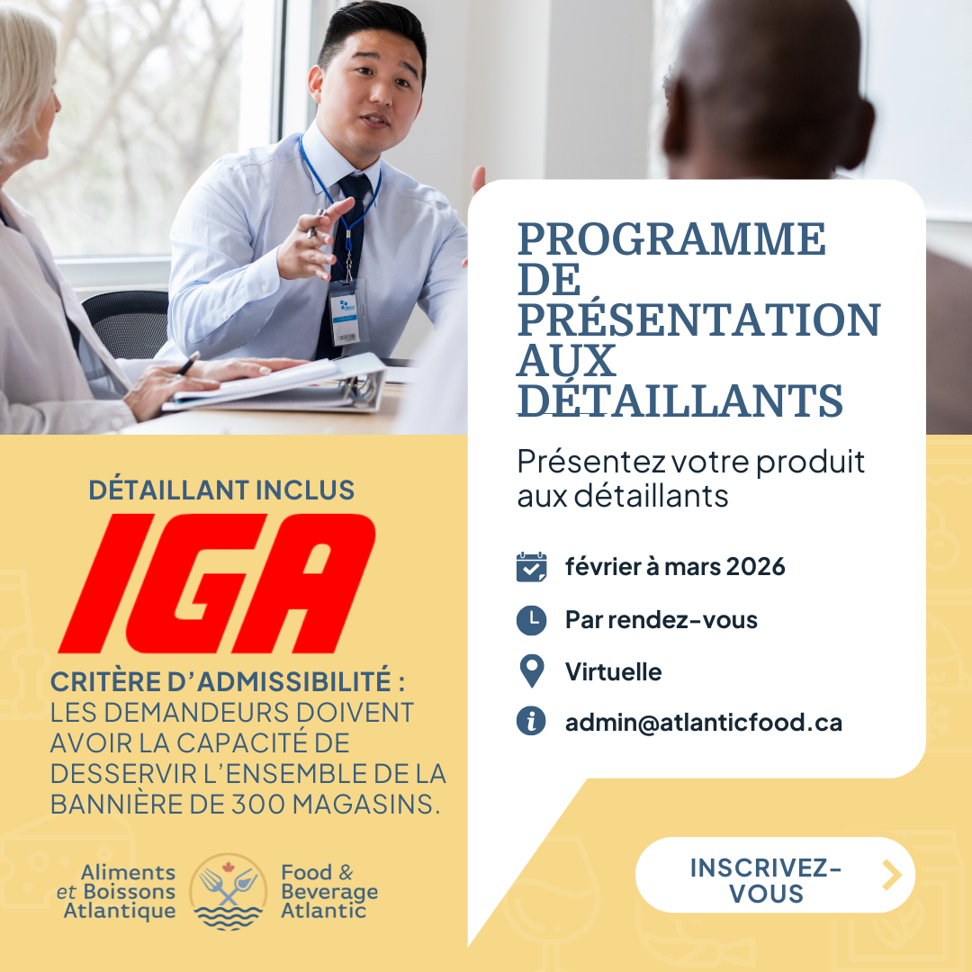 Si vous êtes un producteur alimentaire ou de boissons du Canada atlantique souhaitant accéder au marché de détail, voici votre occasion de présenter votre marque à des décideurs clés et de passer à la prochaine étape!