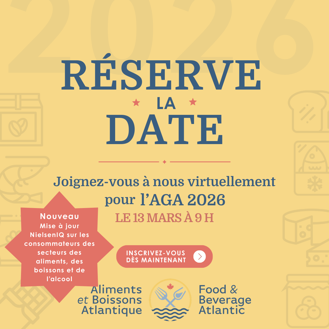 Aliments et Boissons Atlantique vous invite à participer à son Assemblée générale annuelle (AGA) 2026 — un rendez-vous incontournable pour les membres qui souhaitent rester informés, connectés et à l’avant-garde des tendances de l’industrie. C’est l’occasion d’échanger avec des leaders du secteur, de faire le point sur les principales initiatives d’ABA et de contribuer à façonner l’avenir de l’industrie des aliments et des boissons au Canada atlantique.